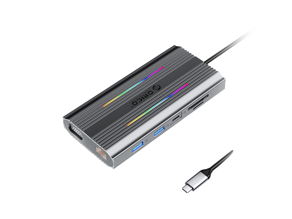 EAN: 6941788803831Priključna postaja z aluminijastim ohišjem z RGB LED osvetlitvijo. Razširi en USB-C na 1x USB-C 3.1, 1x USB-C PD100W, 3x USB-A 3.1, 1x USB-A 2.0, 1x HDMI 1.4 4K@30Hz in 1x VGA 1080p. Ima tudi čitalec kartic SD in TF, mrežni priključek RJ45 in 3,5 mm avdio vhod.