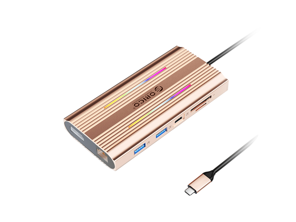 Priključna postaja USB-C 12 v 1, RGB, USB-C 3.1, 3x USB-A, USB-C PD100W, 2x HDMI 4K@60Hz, DP 4K@60Hz, SD+TF, RJ45, AUX, Aluminij, roza, ORICO XDR-X3