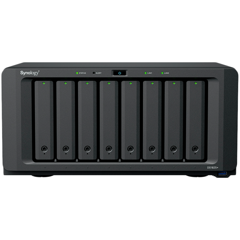Synology DiskStation DS1825+, Tower, 8-BAY 3.5'' SATA HDD/SSD, 2xM.2 2280 NVMe SSD, CPU AMD Ryzen Quad-Core 2.2 GHz, 8GB DDR4, 2xRJ-45 2.5GbE LAN Port, 3xUSB 3.2, 2 x USB-C expansion ports (Expandable to 18 Bays with 2 x DX525), 1xGen3 x8 PCIe,3y