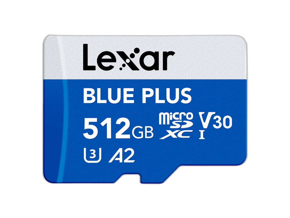 Micro SDXC UHS-I kartica Lexar Blue Plus s kapaciteto 512GB. Kartica ima hitrost branja do 170 MB/s.