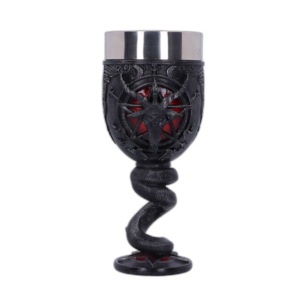 EAN: 801269131470Iz prepletenih misli oblikovalske ekipe Nemesis Now prihaja ta okultni kelih.Na vsaki strani keliha je majhno rdeče ozadje z lakiranim sijajem, nad katerim se dviga reliefen pentagram. Zunanje krožnice krasi napis »Solve« in »Coagula«.Na vrhu se dviga glava trogrogega sabatskega kozla, iz čigar lobanje se dviga pentagram. Nad glavo se nahajata dva polmeseca, pod njo pa glavi dveh kraljevskih kobr, pripravljeni na napad.Pecelj keliha je oblikovan iz zvitega kozjega roga, ki se elegantno spušča v osnovo v obliki pentagrama.Izdelek je ulivan iz najfinejše smole in nato natančno ročno poslikan, zato je popoln dodatek za vsak gotski dom.V notranjosti ima vložek iz nerjavnega jekla, ki omogoča enostavno čiščenje.