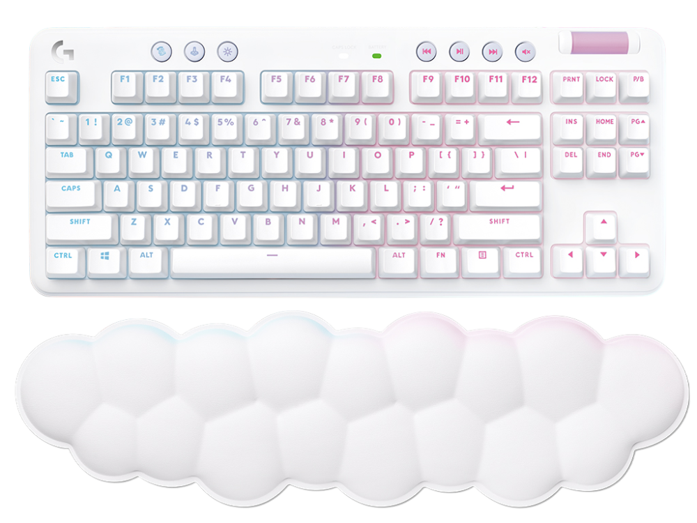 Tipkovnica vsebuje naslon za zapestje v obliki oblakov, ki podpira zapestje med igranjem. TKL format z 87 tipkami je kompakten in zasede manj prostora na mizi.