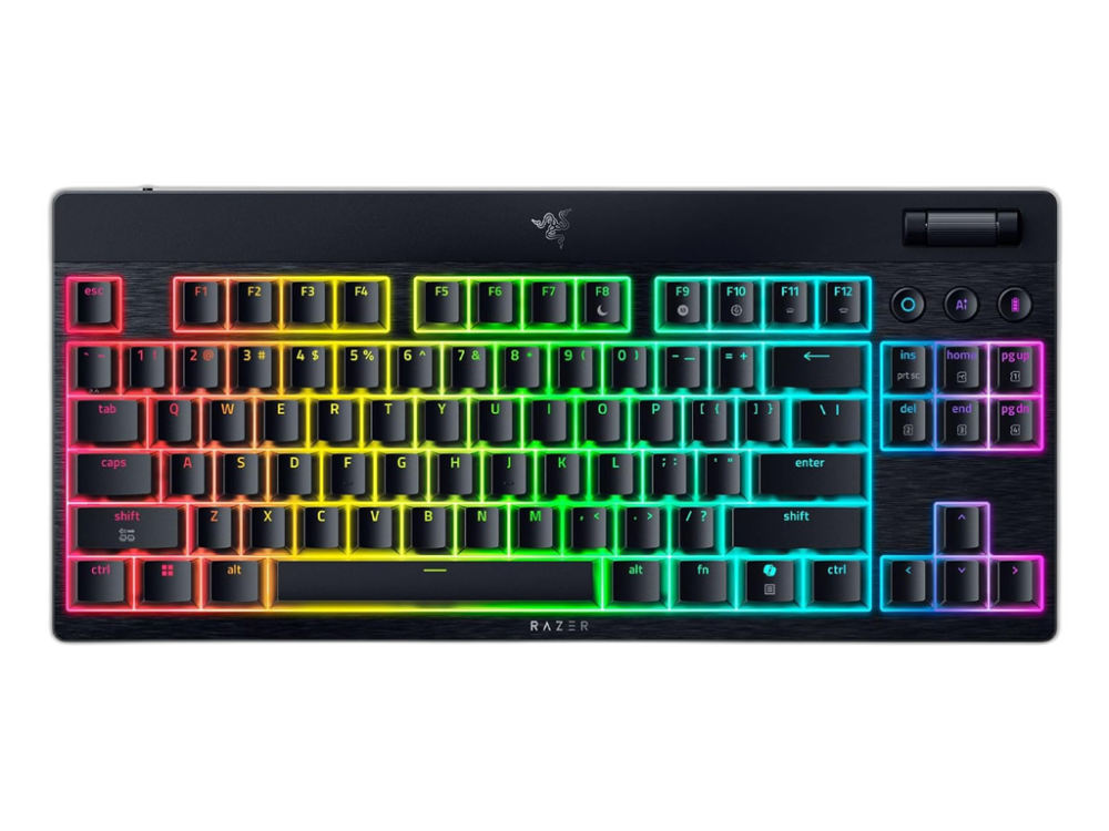 EAN: 8887910073759Nizkoprofilna brezžična mehanska tipkovnica z zelenimi (clicky) mehanskimi stikali, zgornjo ploščo iz aluminija, dvoslojnimi PBT tipkami in optimizirano akustiko pri tipkanju v TKL formatu. Omogoča brezžično povezavo z USB sprejemnikom ali Bluetoothom, ter povezavo s kablom. Ima večfunkcijski kolešček in 3 dodatni nadzorni gumbi. Baterija omogoča do 980 ur uporabe. Opremljena z Razer Chroma RGB osvetlitvijo.